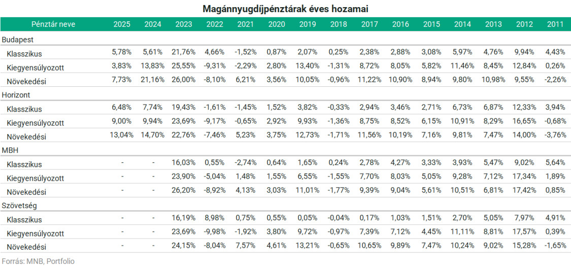 A 2025-ös évet a két versenyző közül a Horizont nyerte, 6,5%-13% közti hozamot tehettek zsebre a megtakarítók, attól függően, hogy milyen portfólióban ültek. A Budapest is pozitív, de kisebb hozamokat produkált, itt 3,8%-7,7% között alakult a tavalyi nyereség.