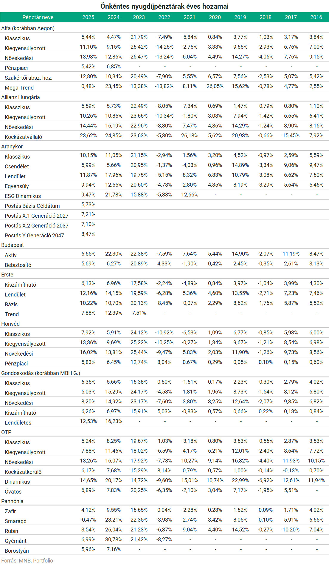 A Portfolio a magánnyugdíjpénztárak teljesítményét is rendszeresen nyomon követi, bár a szektor taglétszáma évről évre zsugorodik, mostanra alig 50 ezer tagról beszélhetünk, szemben az 1,1 millió tagot számláló önkéntes nyugdíjpénztári piaccal. A pénztárak közül mostanra kettő maradt talpon, miután 2024-ben a Szövetség beolvadt a Horizontba, az MKB/MBH pedig a Budapestbe.
