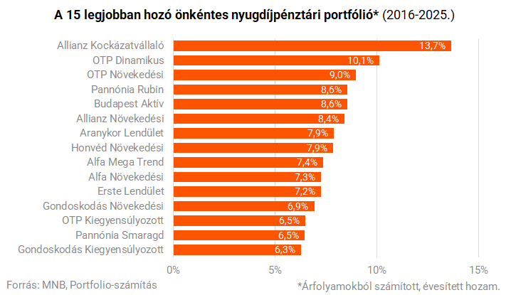 Ha a 2016-2025. közti 10 éves időszakot nézzük, a verhetetlen Allianz Kockázatvállaló portfólió mögött az OTP két portfóliója teljesített a legjobban, rendre 10 és 9 százalékos évesített hozammal. A tizenötös toplistára ilyen időtávon már 6,3%-os hozammal is fel lehetett kerülni. (A vizsgálatban csak a legalább 10 éves múlttal bíró portfóliókat vettük figyelembe.)
