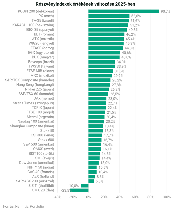 Páratlanul izgalmas évük volt 2025-ben a befektetőknek, az év első felében a kirobbanó globális vámháború borzolta a kedélyeket és az árfolyamokat, év végére azonban új csúcsokat döntöttek a piacok. A legjobban muzsikáló tőzsdék rangsorában előkelő helyezést szereztek meg a közép-európaiak, például a cseh, a román, a lengyel vagy akár a magyar indexek: nehéz volt mellényúlni, csak úgy röpködtek a 40-50% közötti éves hozamok.