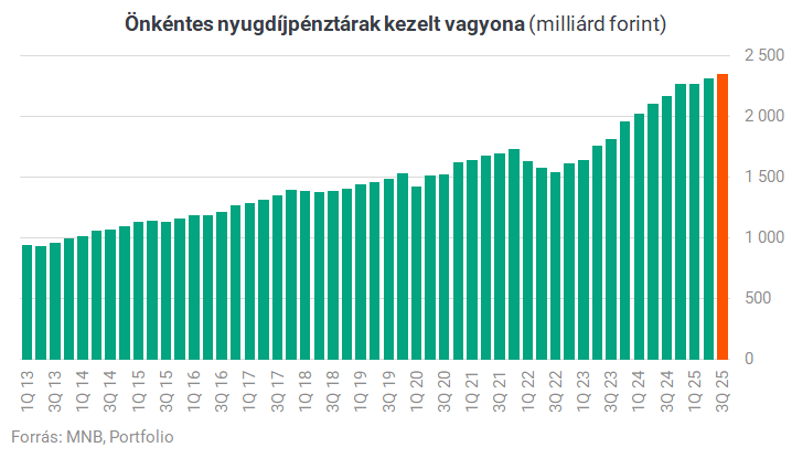 A 2025. harmadik negyedévi állapot szerint a nyugdíjpénztárak kezelt vagyona rekordmagasságba, 2352 milliárd forintra emelkedett, azaz egy megtakarítóra átlagosan kb. 2,2 millió forintos számlaegyenleg jutott. Ez a mai, 259 ezer forintos átlagnyugdíj alapján 8,5 havi átlagnyugdíj összegének felel meg.