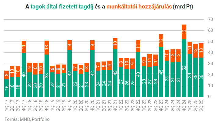 Az első három negyedévben kb. 147 milliárd forintnyi befizetés érkezett a pénztári számlákra, ezt nagyobb részben a saját befizetések, kisebb részben a munkáltatói hozzájárulások tették ki.