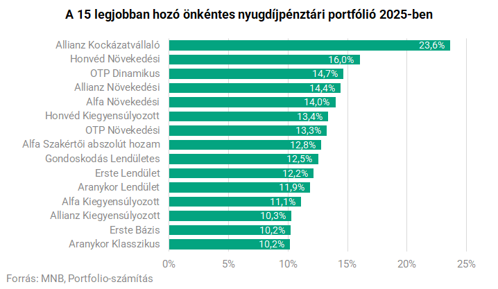 Ebben a vegyes környezetben kellett helytállniuk a nyugdíjpénztári portfólióknak, és sokuk sikerrel vette az akadályokat, a legjobb portfólió közel 24%-ot hozott tavaly, sőt, a legjobb 15 közé sem lehetett bekerülni 10%-nál gyengébb hozamteljesítménnyel. Az alábbi ábrán mutatjuk, mely pénztárak mely portfóliói bizonyultak 2025 győzteseinek.